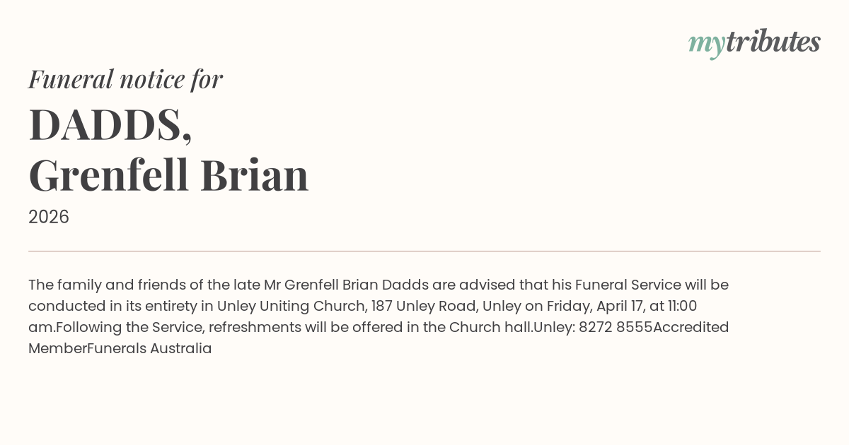 The family and friends of the late Mr Grenfell Brian Dadds are advised that his Funeral Service will be conducted in its entirety in Unley Uniting Church, 187 Unley Road, Unley on Friday, April 17, at 11:00 am.