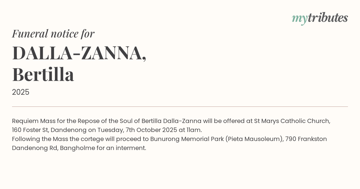 Requiem Mass for the Repose of the Soul of Bertilla Dalla-Zanna will be offered at St Mary’s Catholic Church, 160 Foster St, Dandenong on Tuesday, 7th October 2025 at 11am.