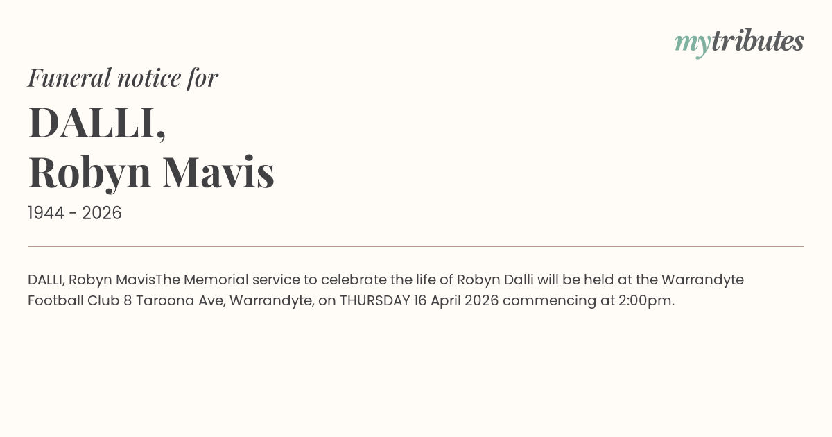 The Memorial service to celebrate the life of Robyn Dalli will be held at the Warrandyte Football Club 8 Taroona Ave, Warrandyte, on THURSDAY 16 April 2026 commencing at 2:00pm.