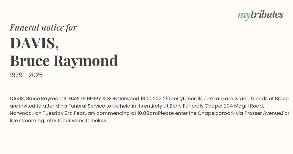 Family and friends of Bruce are invited to attend his Funeral Service to be held in its entirety at Berry Funerals Chapel 204 Magill Road, Norwood. on Tuesday 3rd February commencing at 10.00am