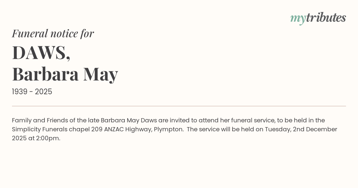 Family and Friends of the late Barbara May Daws are invited to attend her funeral service, to be held in the Simplicity Funerals chapel 209 ANZAC Highway, Plympton. The service will be held on Tuesday, 2nd December 2025 at 2:00pm.