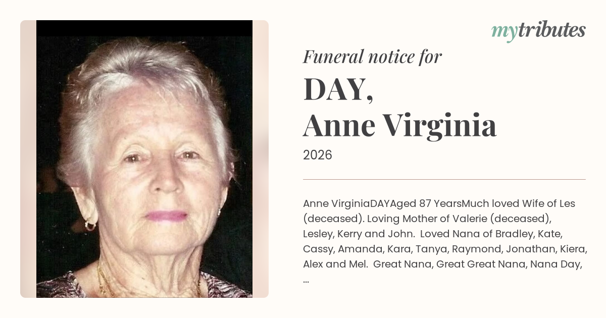 All Family and Friends are respectfully invited to attend ANNE'S CELEBRATION of LIFE which will commence at 2.00 p.m. MONDAY AFTERNOON 13th APRIL, 2026 at the Lakes Chapel, Morleys Funeral Home, Cnr. Hugh Street and Martinez Avenue, Townsville.