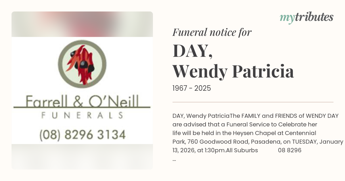 The FAMILY and FRIENDS of WENDY DAY are advised that a Funeral Service to Celebrate her life will be held in the Heysen Chapel at Centennial Park, 760 Goodwood Road, Pasadena, on TUESDAY, January 13, 2026, at 1:30pm.