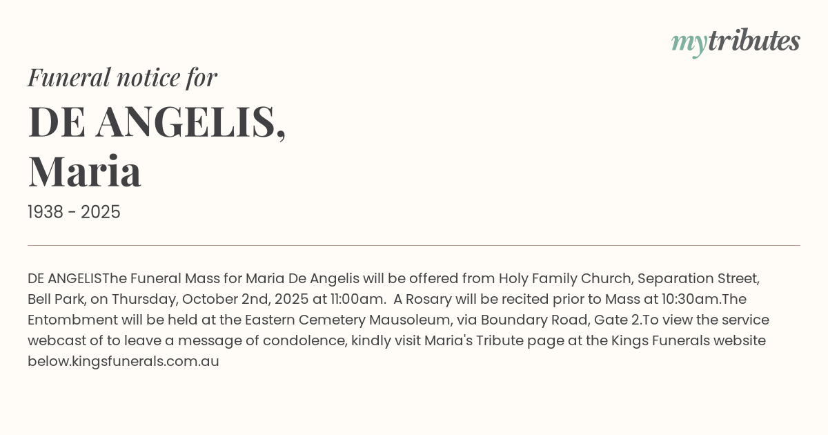 To view the service webcast of to leave a message of condolence, kindly visit Maria's Tribute page at the Kings Funerals website below.