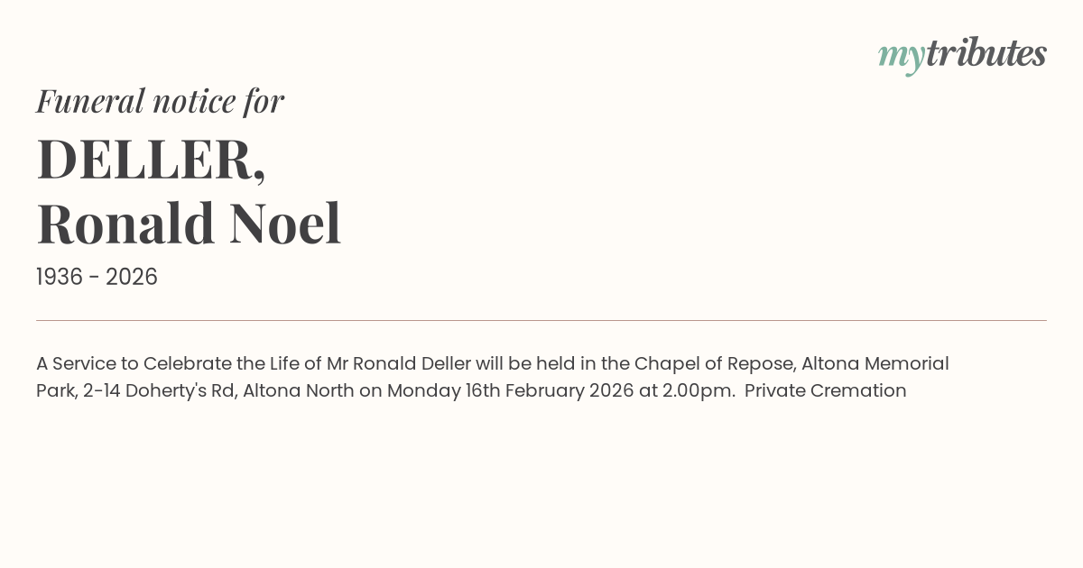 A Service to Celebrate the Life of Mr Ronald Deller will be held in the Chapel of Repose, Altona Memorial Park, 2-14 Doherty's Rd, Altona North on Monday 16th February 2026 at 2.00pm. Private Cremation