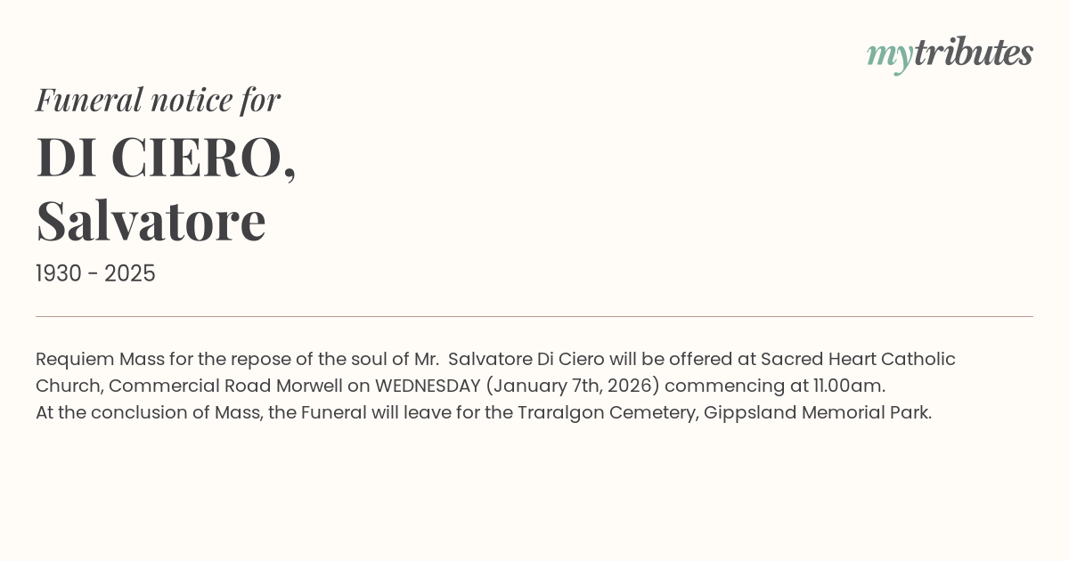 Requiem Mass for the repose of the soul of Mr. Salvatore Di Ciero will be offered at Sacred Heart Catholic Church, Commercial Road Morwell on WEDNESDAY (January 7th, 2026) commencing at 11.00am.