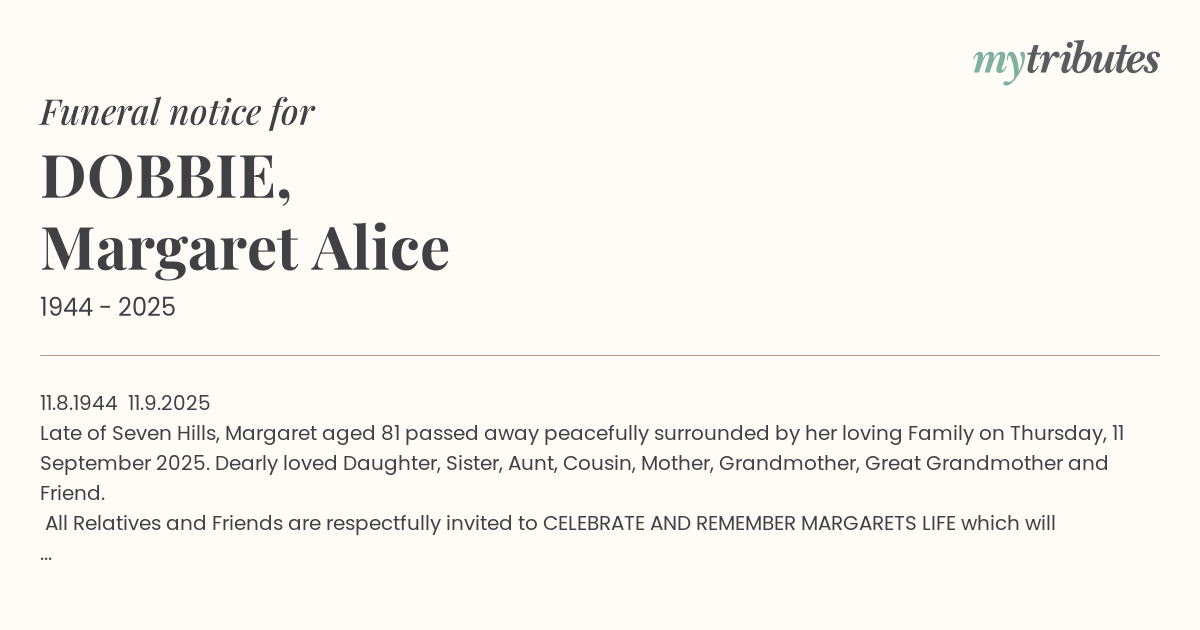 Late of Seven Hills, Margaret aged 81 passed away peacefully surrounded by her loving Family on Thursday, 11 September 2025. Dearly loved Daughter, Sister, Aunt, Cousin, Mother, Grandmother, Great Grandmother and Friend.