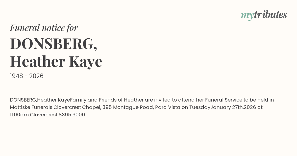 Family and Friends of Heather are invited to attend her Funeral Service to be held in Mattiske Funerals Clovercrest Chapel, 395 Montague Road, Para Vista on Tuesday