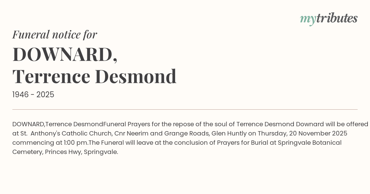 Funeral Prayers for the repose of the soul of Terrence Desmond Downard will be offered at St. Anthony's Catholic Church, Cnr Neerim and Grange Roads, Glen Huntly on Thursday, 20 November 2025 commencing at 1:00 pm.