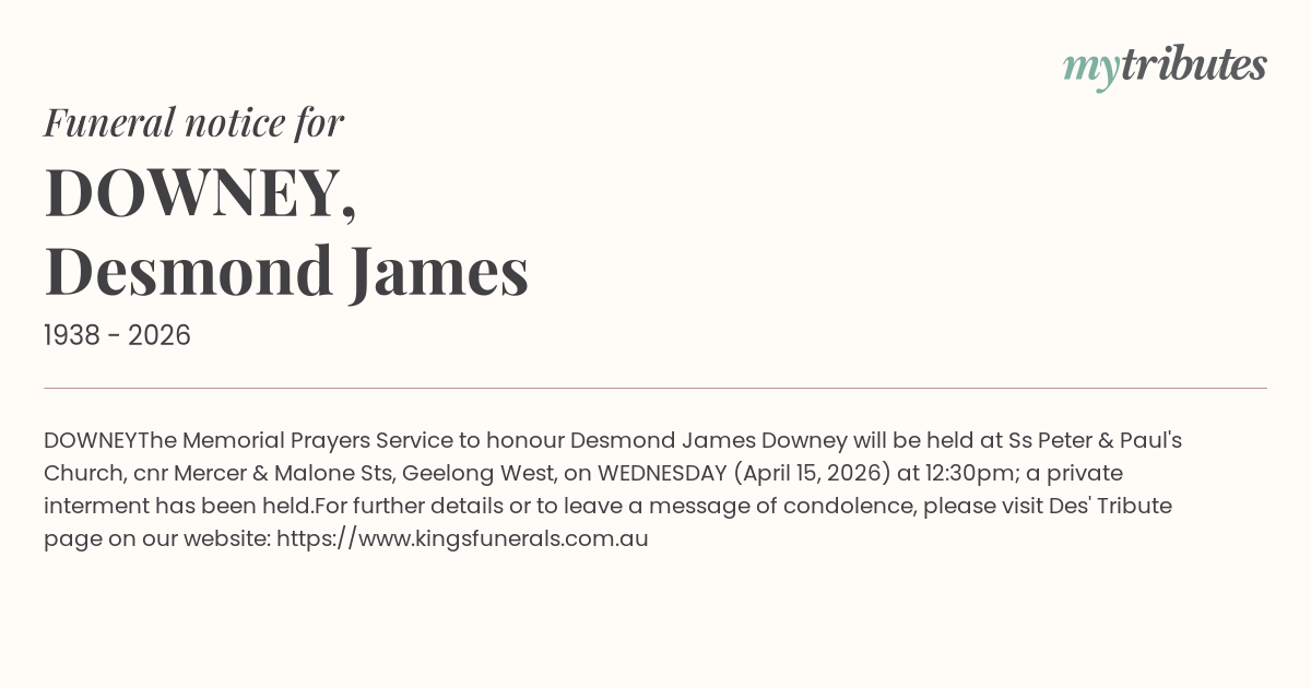 The Memorial Prayers Service to honour Desmond James Downey will be held at Ss Peter & Paul's Church, cnr Mercer & Malone Sts, Geelong West, on WEDNESDAY (April 15, 2026) at 12:30pm; a private interment has been held.