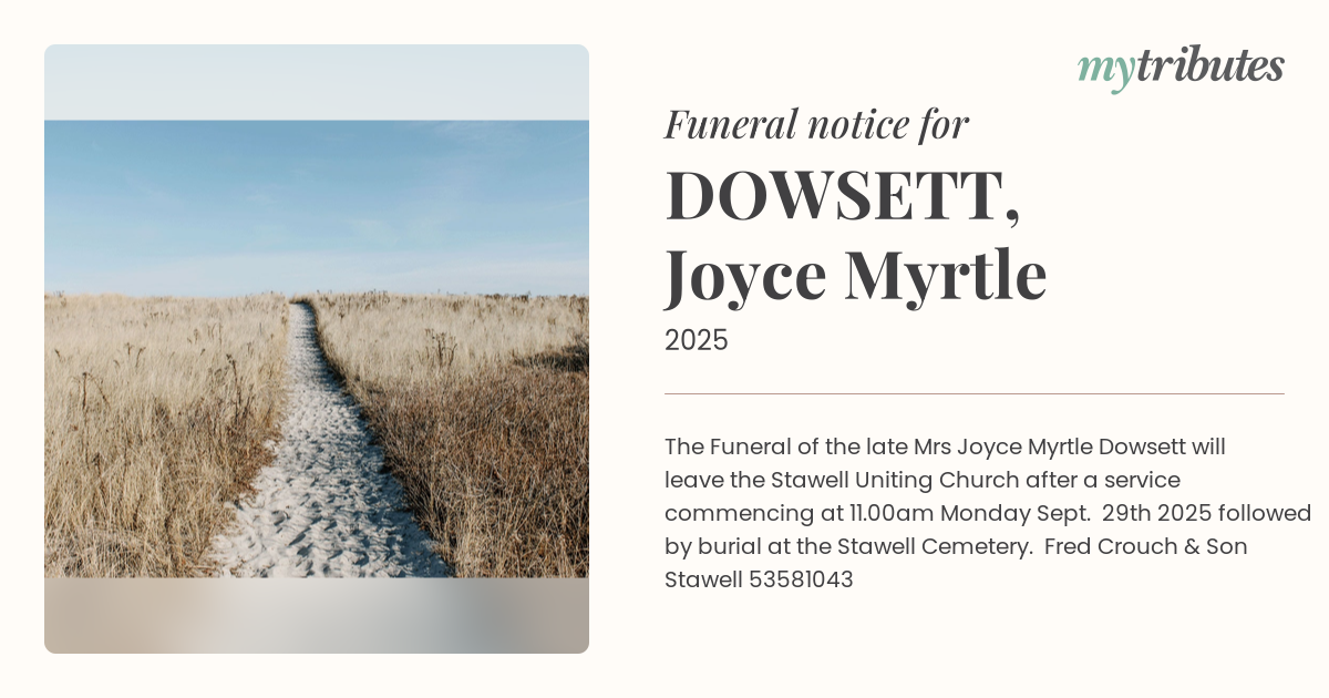 The Funeral of the late Mrs Joyce Myrtle Dowsett will leave the Stawell Uniting Church after a service commencing at 11.00am Monday Sept. 29th 2025 followed by burial at the Stawell Cemetery. Fred Crouch & Son Stawell 5358...