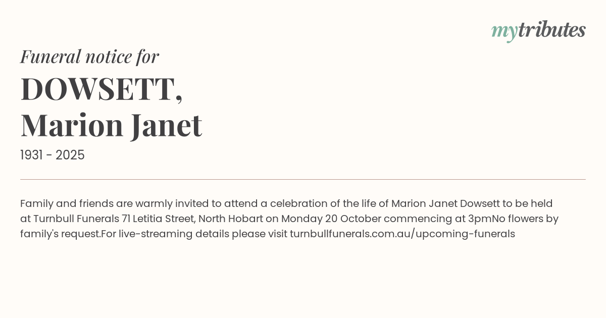 Family and friends are warmly invited to attend a celebration of the life of Marion Janet Dowsett to be held at Turnbull Funerals 71 Letitia Street, North Hobart on Monday 20 October commencing at 3pm