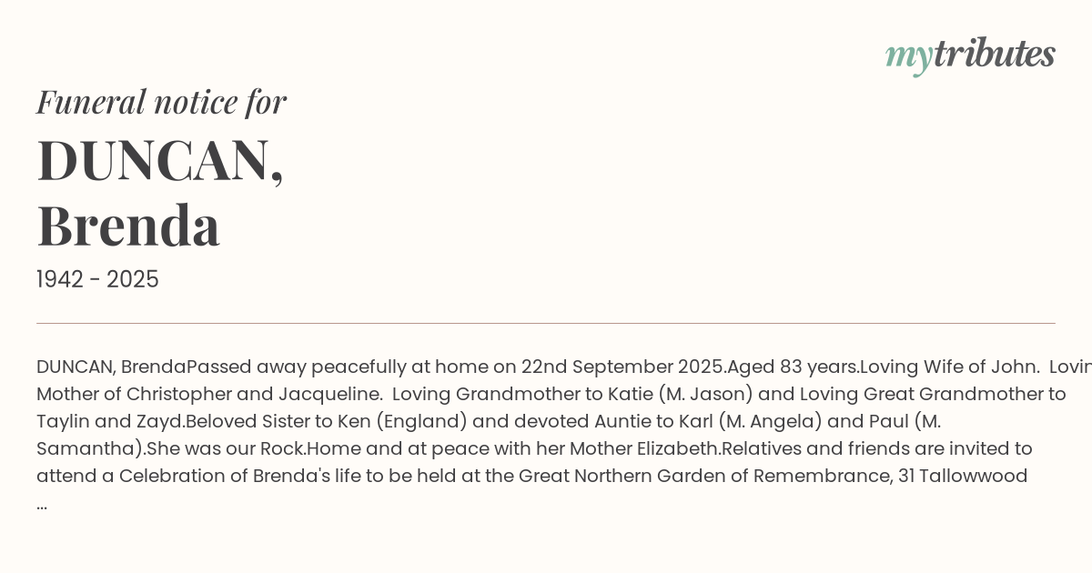 Relatives and friends are invited to attend a Celebration of Brenda's life to be held at the Great Northern Garden of Remembrance, 31 Tallowwood Dr, Deception Bay, Wednesday 8th October, 2025 commencing at 11am.