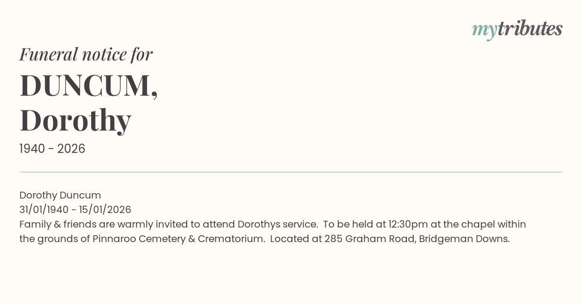Family & friends are warmly invited to attend Dorothys service. To be held at 12:30pm at the chapel within the grounds of Pinnaroo Cemetery & Crematorium. Located at 285 Graham Road, Bridgeman Downs.