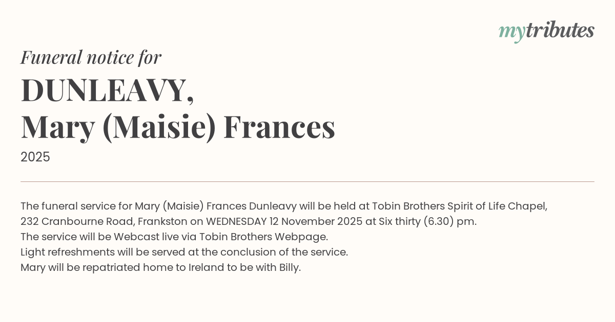 The funeral service for Mary (Maisie) Frances Dunleavy will be held at Tobin Brothers Spirit of Life Chapel, 232 Cranbourne Road, Frankston on WEDNESDAY 12 November 2025 at Six thirty (6.30) pm.