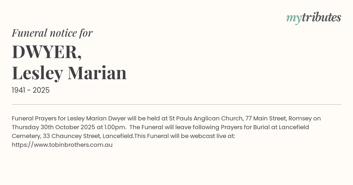 Funeral Prayers for Lesley Marian Dwyer will be held at St Paul’s Anglican Church, 77 Main Street, Romsey on Thursday 30th October 2025 at 1.00pm. The Funeral will leave following Prayers for Burial at Lancefield Cemetery, 33 Chauncey Street, Lancefield.