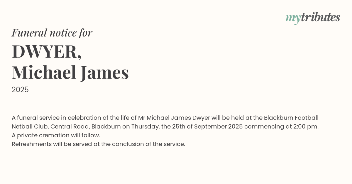 A funeral service in celebration of the life of Mr Michael James Dwyer will be held at the Blackburn Football Netball Club, Central Road, Blackburn on Thursday, the 25th of September 2025 commencing at 2:00 pm.