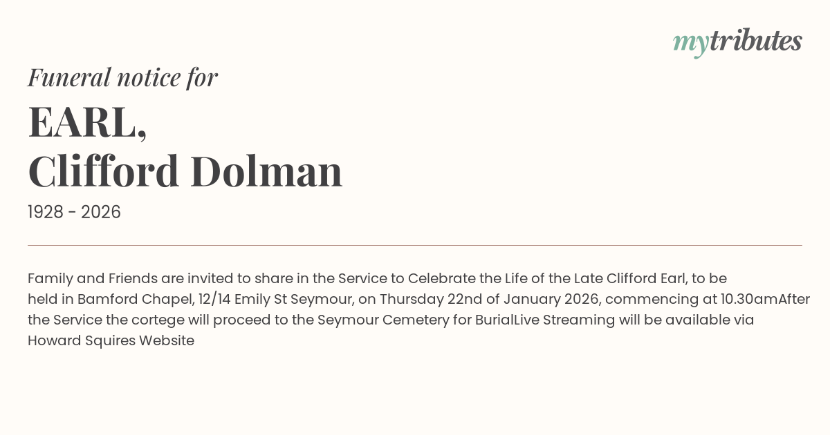 Family and Friends are invited to share in the Service to Celebrate the Life of the Late Clifford Earl, to be held in Bamford Chapel, 12/14 Emily St Seymour, on Thursday 22nd of January 2026, commencing at 10.30am
