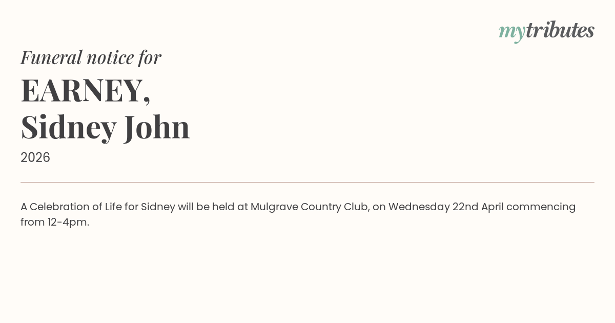 A Celebration of Life for Sidney will be held at Mulgrave Country Club, on Wednesday 22nd April commencing from 12-4pm.