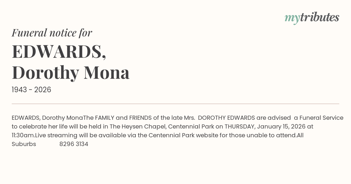 The FAMILY and FRIENDS of the late Mrs. DOROTHY EDWARDS are advised a Funeral Service to celebrate her life will be held in The Heysen Chapel, Centennial Park on THURSDAY, January 15, 2026 at 11:30am.