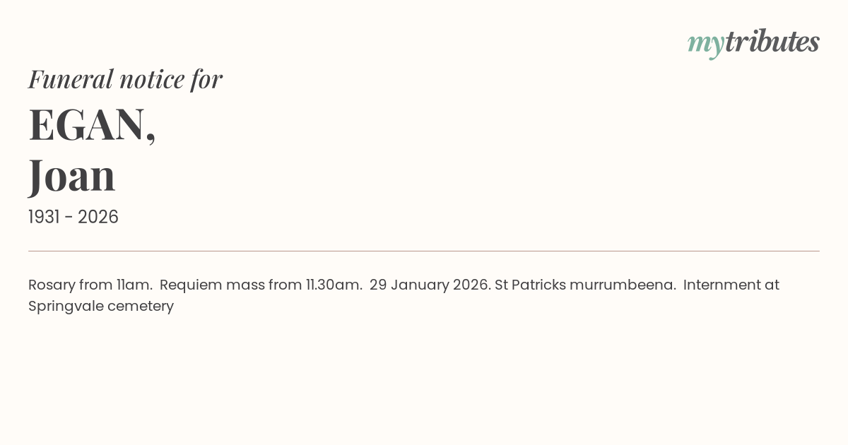 Rosary from 11am. Requiem mass from 11.30am. 29 January 2026. St Patrick’s murrumbeena. Internment at Springvale cemetery