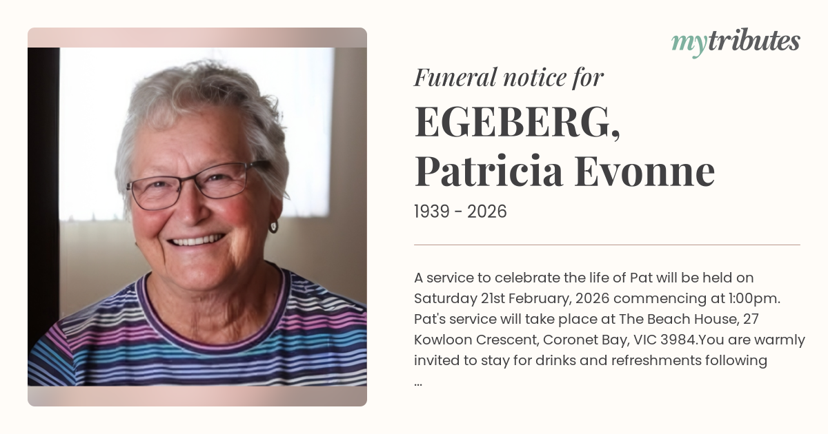 A service to celebrate the life of Pat will be held on Saturday 21st February, 2026 commencing at 1:00pm. Pat's service will take place at The Beach House, 27 Kowloon Crescent, Coronet Bay, VIC 3984.