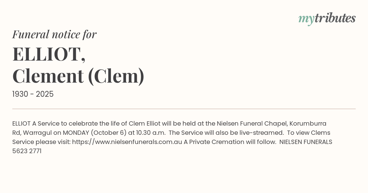 A Service to celebrate the life of Clem Elliot will be held at the Nielsen Funeral Chapel, Korumburra Rd, Warragul on MONDAY (October 6) at 10.30 a.m.