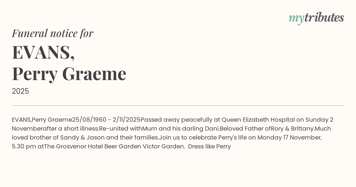 Join us to celebrate Perry's life on Monday 17 November, 5.30 pm at
