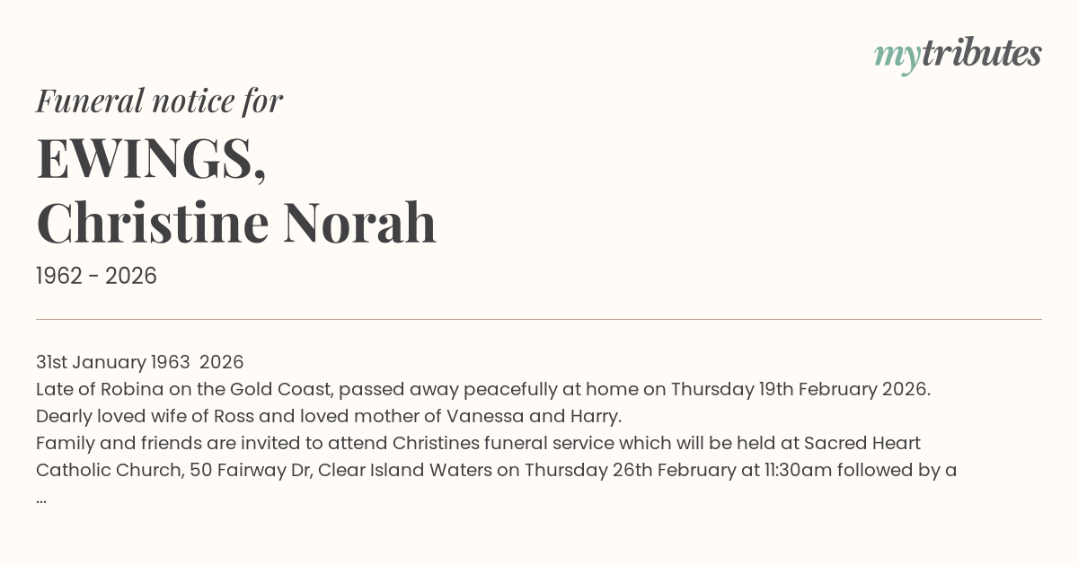 31st January 1963 – 2026 Late of Robina on the Gold Coast, passed away peacefully at home on Thursday 19th February 2026. Dearly loved wife of Ross and loved mother of Vanessa and Harry. Family and friends are invited to attend Christine’s funeral service which will be held at Sacred Heart Catholic Church, 50 Fairway Dr, Clear Island Waters on Thursday 26th February at 11:30am followed by a graveside committal at the Mudgeeraba Cemetery.