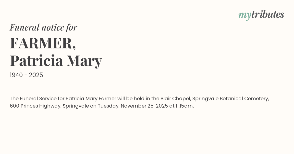 The Funeral Service for Patricia Mary Farmer will be held in the Blair Chapel, Springvale Botanical Cemetery, 600 Princes Highway, Springvale on Tuesday, November 25, 2025 at 11.15am.