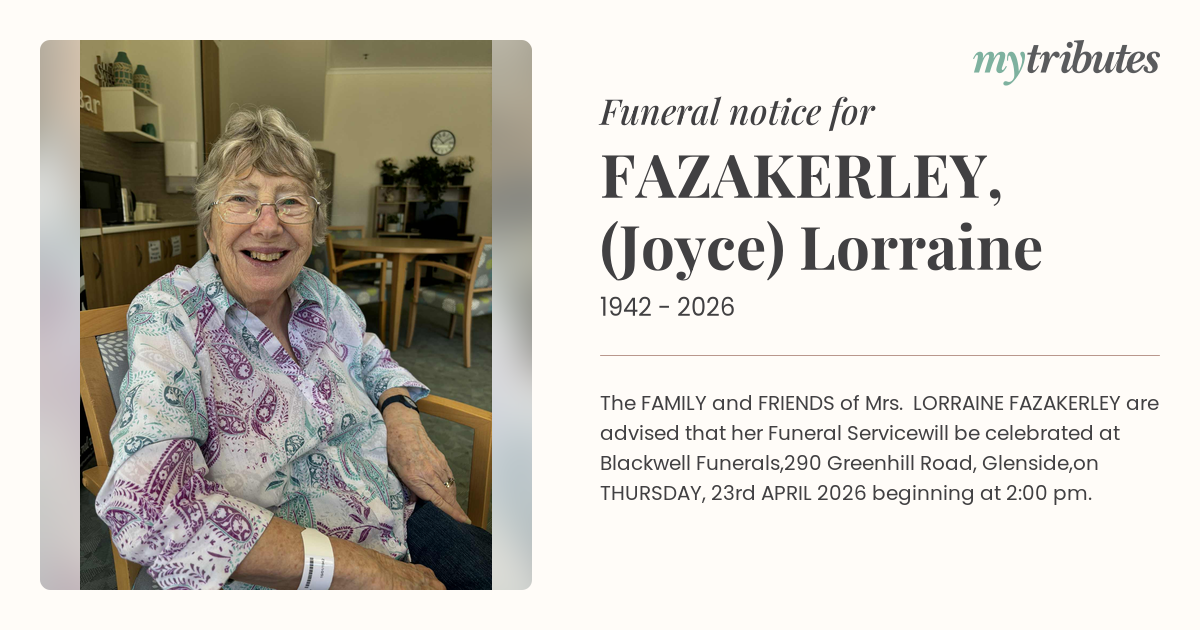The FAMILY and FRIENDS of Mrs. LORRAINE FAZAKERLEY are advised that her Funeral Service