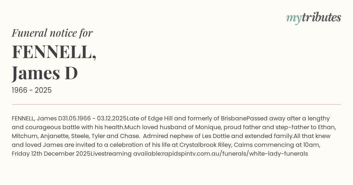 All that knew and loved James are invited to a celebration of his life at Crystalbrook Riley, Cairns commencing at 10am, Friday 12th December 2025