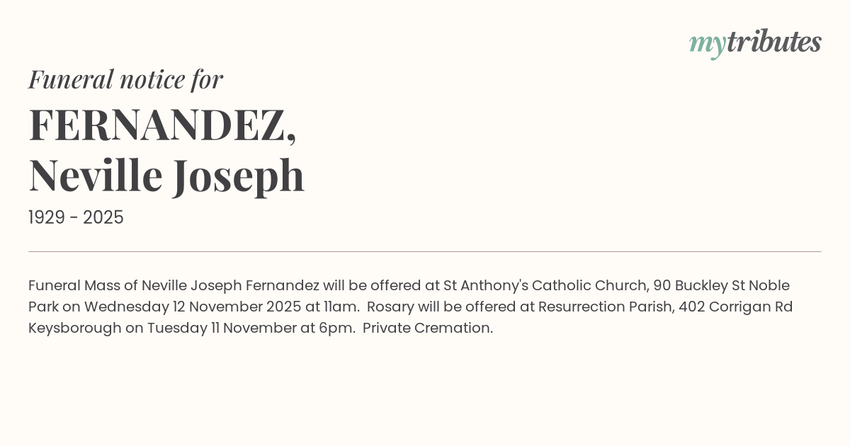 Funeral Mass of Neville Joseph Fernandez will be offered at St Anthony's Catholic Church, 90 Buckley St Noble Park on Wednesday 12 November 2025 at 11am. Rosary will be offered at Resurrection Parish, 402 Corrigan Rd Keysborough on Tuesday 11 November at 6pm. Private Cremation.