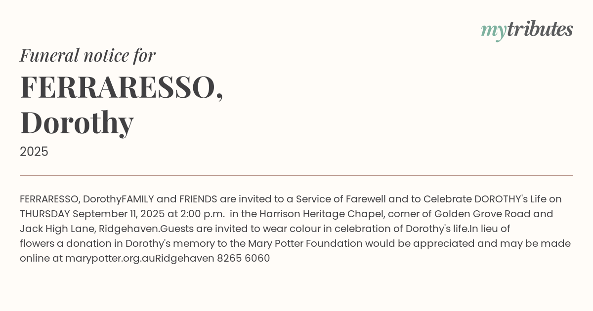 FAMILY and FRIENDS are invited to a Service of Farewell and to Celebrate DOROTHY's Life on THURSDAY September 11, 2025 at 2:00 p.m. in the Harrison Heritage Chapel, corner of Golden Grove Road and Jack High Lane, Ridgehaven.
