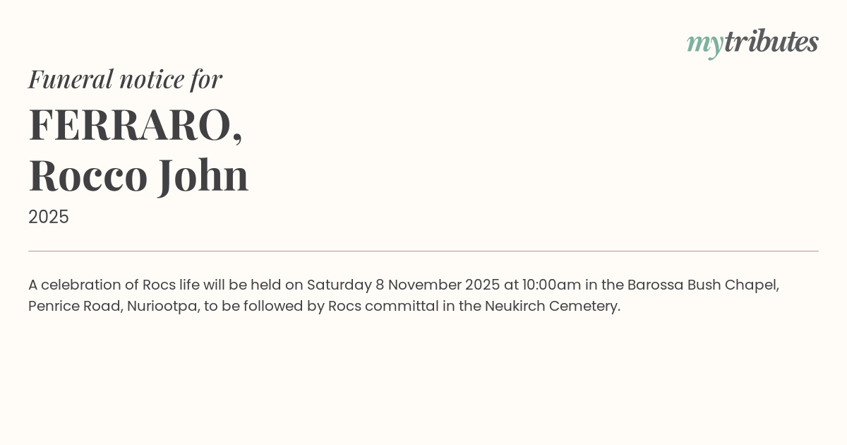 A celebration of Roc’s life will be held on Saturday 8 November 2025 at 10:00am in the Barossa Bush Chapel, Penrice Road, Nuriootpa, to be followed by Roc’s committal in the Neukirch Cemetery.