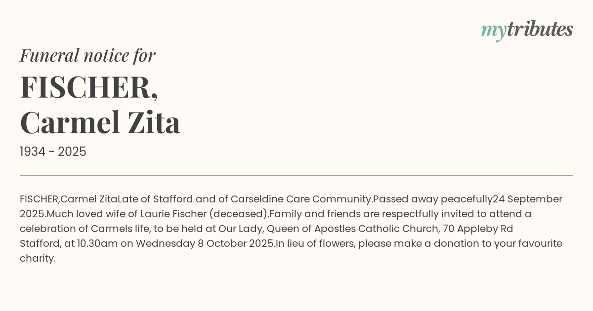 Family and friends are respectfully invited to attend a celebration of Carmel’s life, to be held at Our Lady, Queen of Apostles Catholic Church, 70 Appleby Rd Stafford, at 10.30am on Wednesday 8 October 2025.