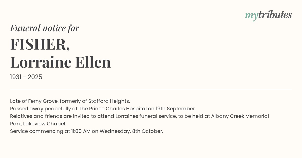 Relatives and friends are invited to attend Lorraine’s funeral service, to be held at Albany Creek Memorial Park, Lakeview Chapel.