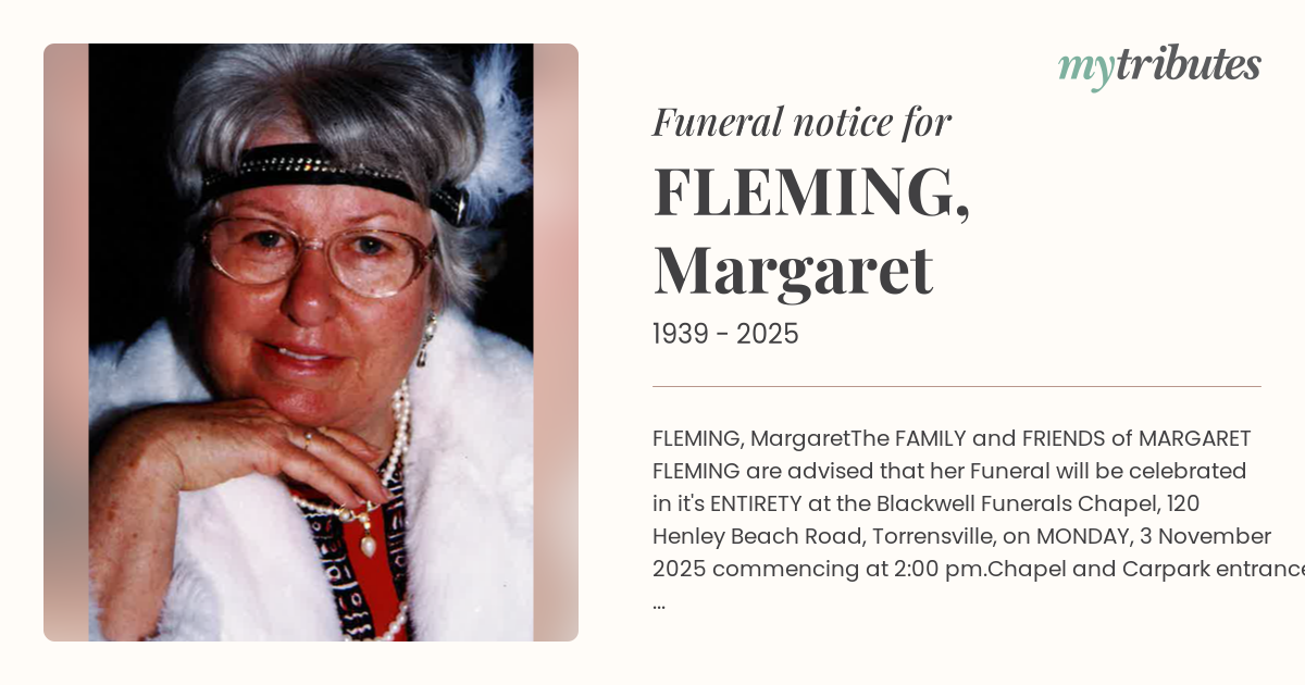 The FAMILY and FRIENDS of MARGARET FLEMING are advised that her Funeral will be celebrated in it's ENTIRETY at the Blackwell Funerals Chapel, 120 Henley Beach Road, Torrensville, on MONDAY, 3 November 2025 commencing at 2:00 pm.