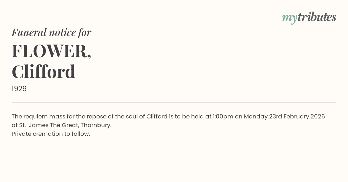 The requiem mass for the repose of the soul of Clifford is to be held at 1:00pm on Monday 23rd February 2026 at St. James The Great, Thornbury.