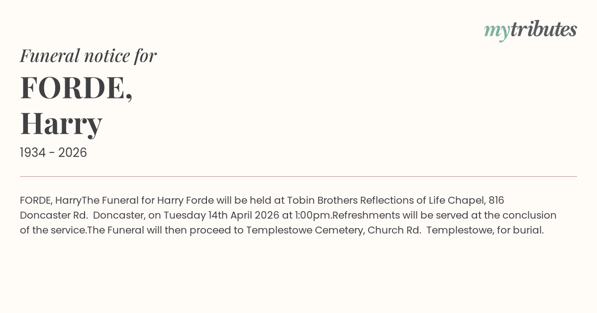 The Funeral for Harry Forde will be held at Tobin Brothers Reflections