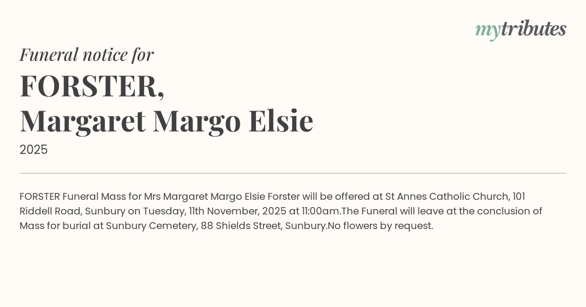 Mrs Margaret “Margo” Elsie Forster will be offered at St Anne’s Catholic Church, 101 Riddell Road, Sunbury on Tuesday, 11th November, 2025 at 11:00am.