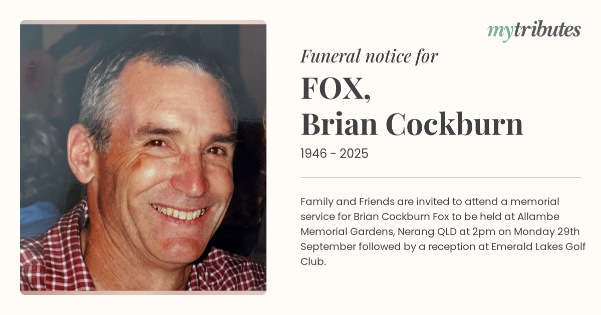 Family and Friends are invited to attend a memorial service for Brian Cockburn Fox to be held at Allambe Memorial Gardens, Nerang QLD at 2pm on Monday 29th September followed by a reception at Emerald Lakes Golf Club.