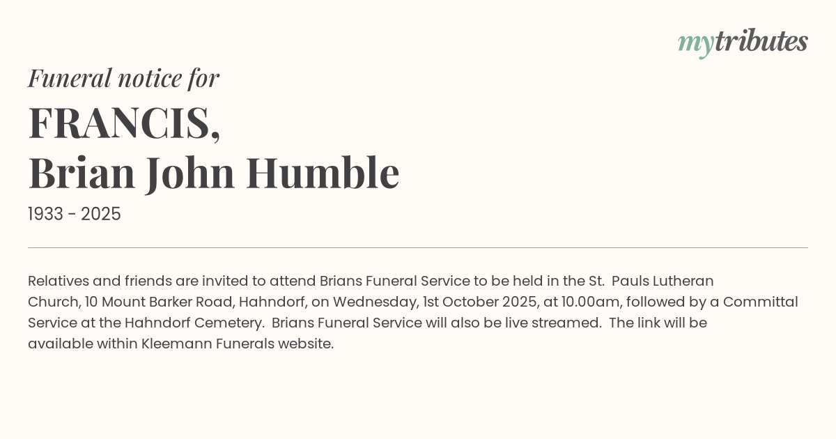 Relatives and friends are invited to attend Brian’s Funeral Service to be held in the St. Paul’s Lutheran Church, 10 Mount Barker Road, Hahndorf, on Wednesday, 1st October 2025, at 10.00am, followed by a Committal Service at the Hahndorf Cemetery. Brian’s Funeral Service will also be live streamed. The link will be available within Kleemann Funerals website.