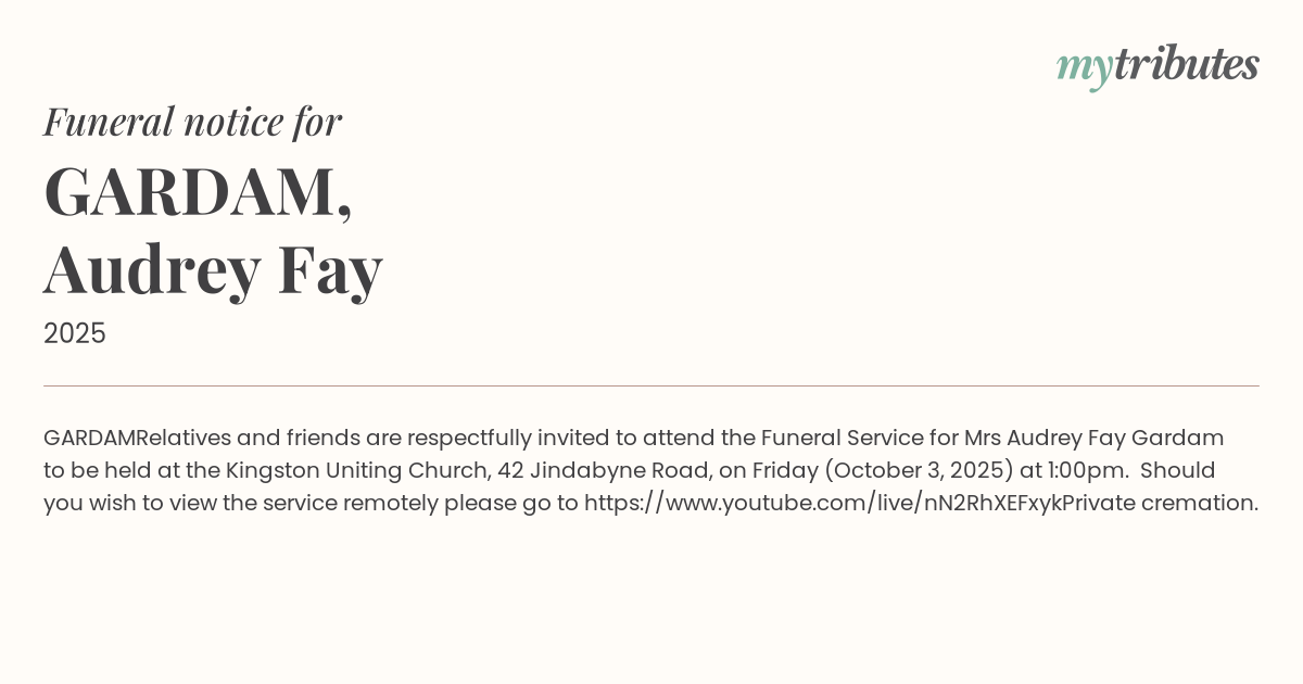 Relatives and friends are respectfully invited to attend the Funeral Service for Mrs Audrey Fay Gardam to be held at the Kingston Uniting Church, 42 Jindabyne Road, on Friday (October 3, 2025) at 1:00pm. Should you wish to view the service remotely please go to https://www.youtube.com/live/nN2RhXEFxyk