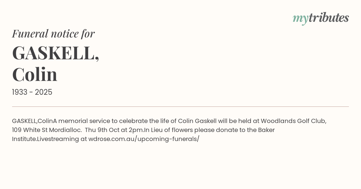 A memorial service to celebrate the life of Colin Gaskell will be held at Woodlands Golf Club, 109 White St Mordialloc. Thu 9th Oct at 2pm.