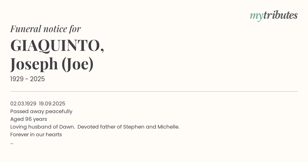 Relatives and friends of Mr Joseph Giaquinto are advised a funeral service to celebrate his life will be held on Wednesday October 8, 2025 commencing at 1.00pm.