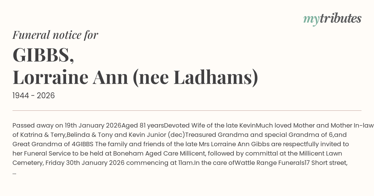 GIBBS The family and friends of the late Mrs Lorraine Ann Gibbs are respectfully invited to her Funeral Service to be held at Boneham Aged Care Millicent, followed by committal at the Millicent Lawn Cemetery, Friday 30th January 2026 commencing at 11am.