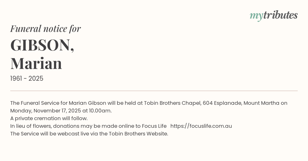 The Funeral Service for Marian Gibson will be held at Tobin Brothers Chapel, 604 Esplanade, Mount Martha on Monday, November 17, 2025 at 10.00am.