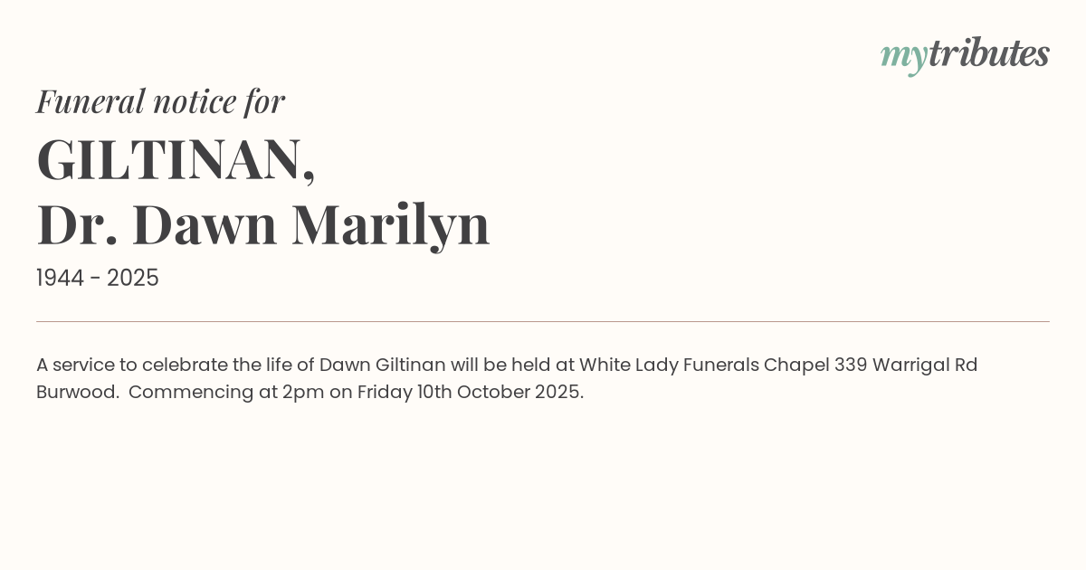 A service to celebrate the life of Dawn Giltinan will be held at White Lady Funerals Chapel 339 Warrigal Rd Burwood. Commencing at 2pm on Friday 10th October 2025.