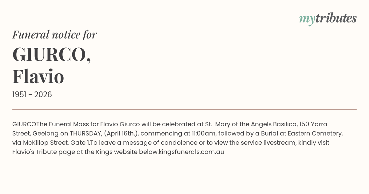 To leave a message of condolence or to view the service livestream, kindly visit Flavio's Tribute page at the Kings website below.